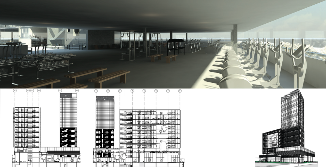 The 16-storey building consists of commercial units and common areas in the first four levels and apartments distributed in two towers in the remaining floors. Each floor had a maximum of 8 apartments and 4 lofts. Facades respond to the solar radiation, with double skins in spots with maximum ex- position. All common areas and apartments are naturally ventilated reducing energy consumption and CO2 emissions.