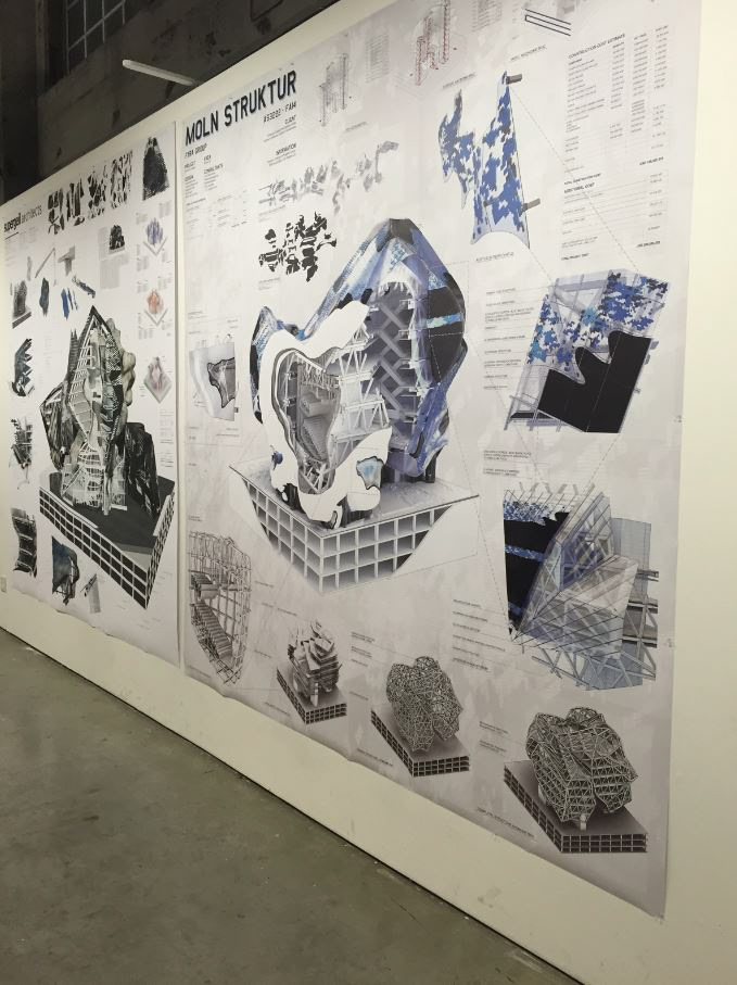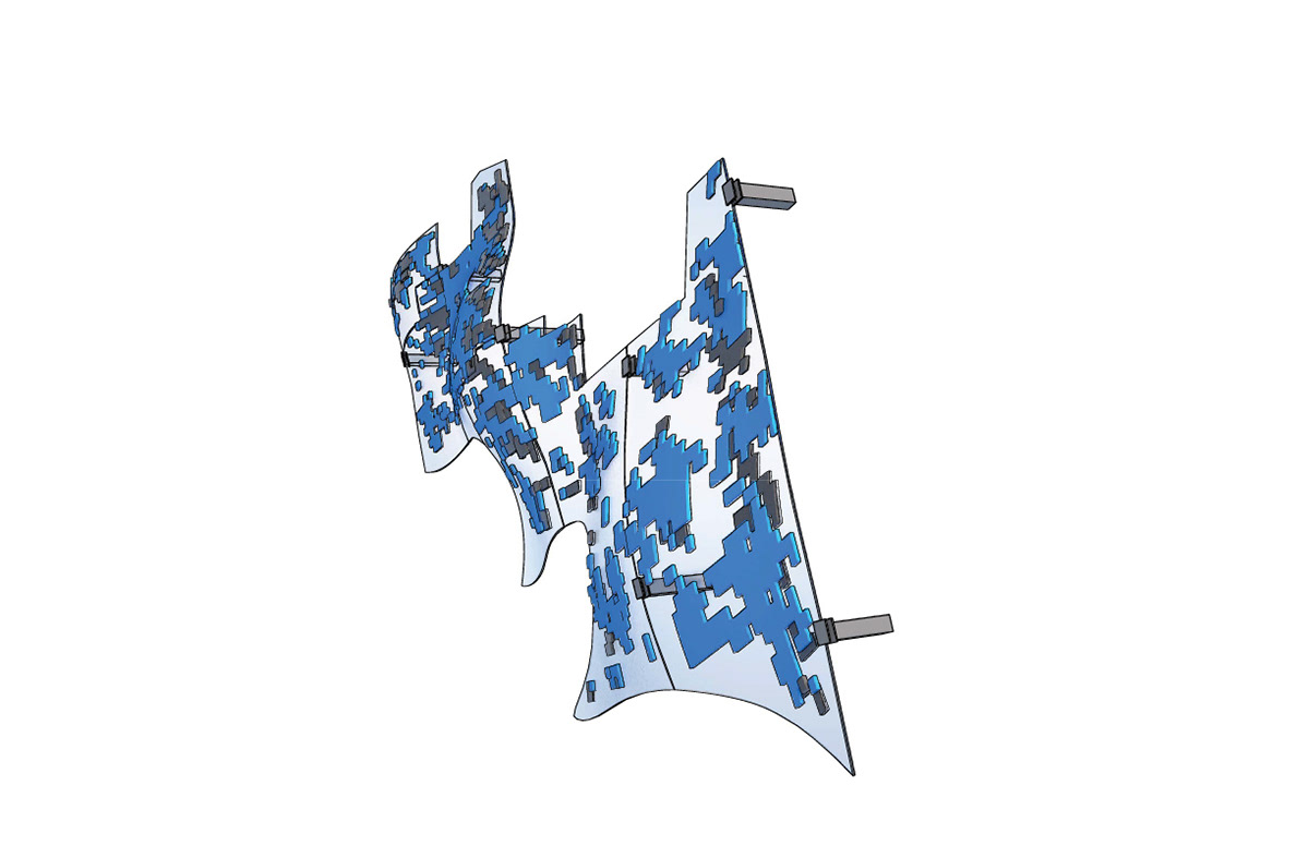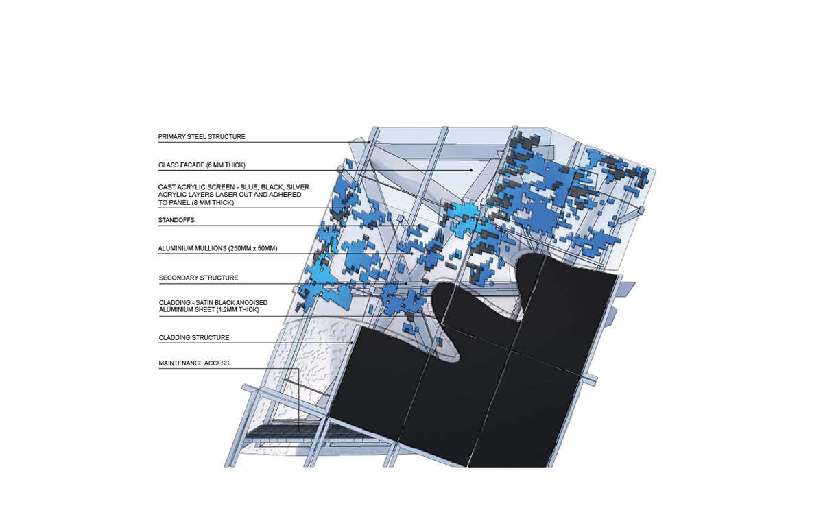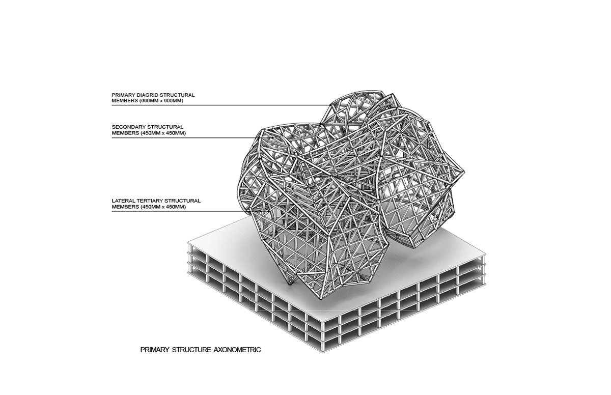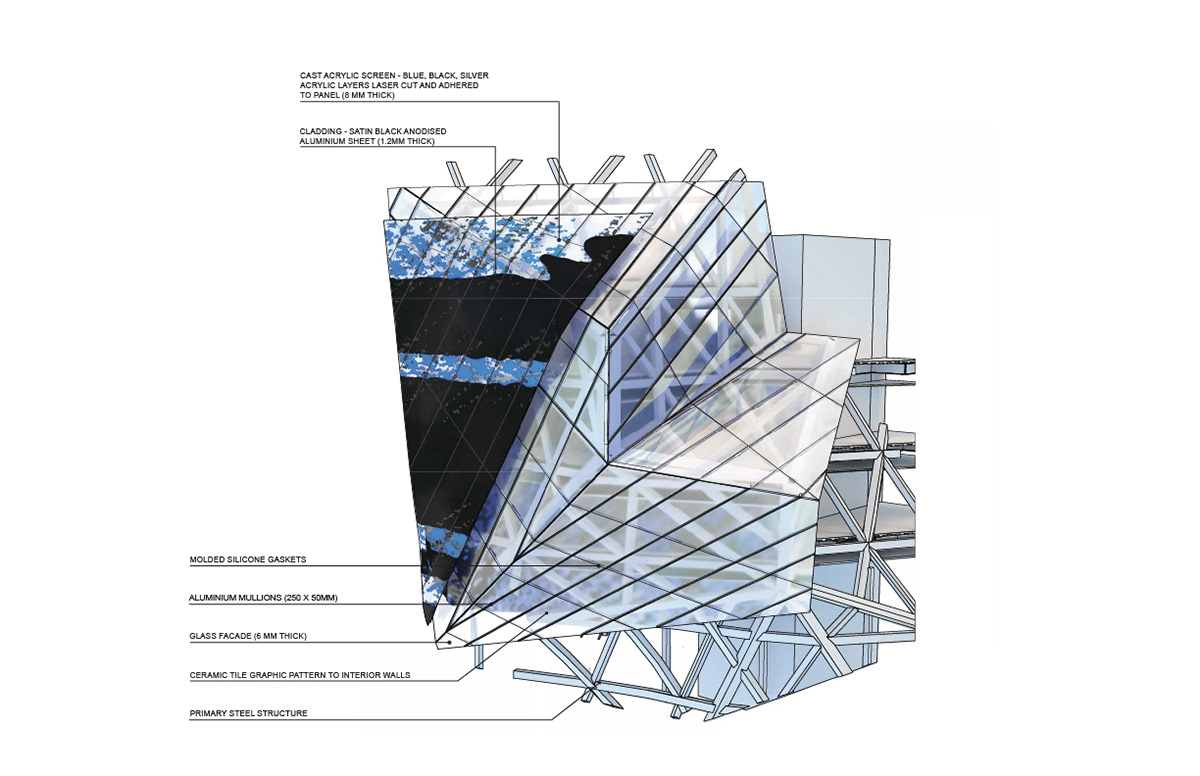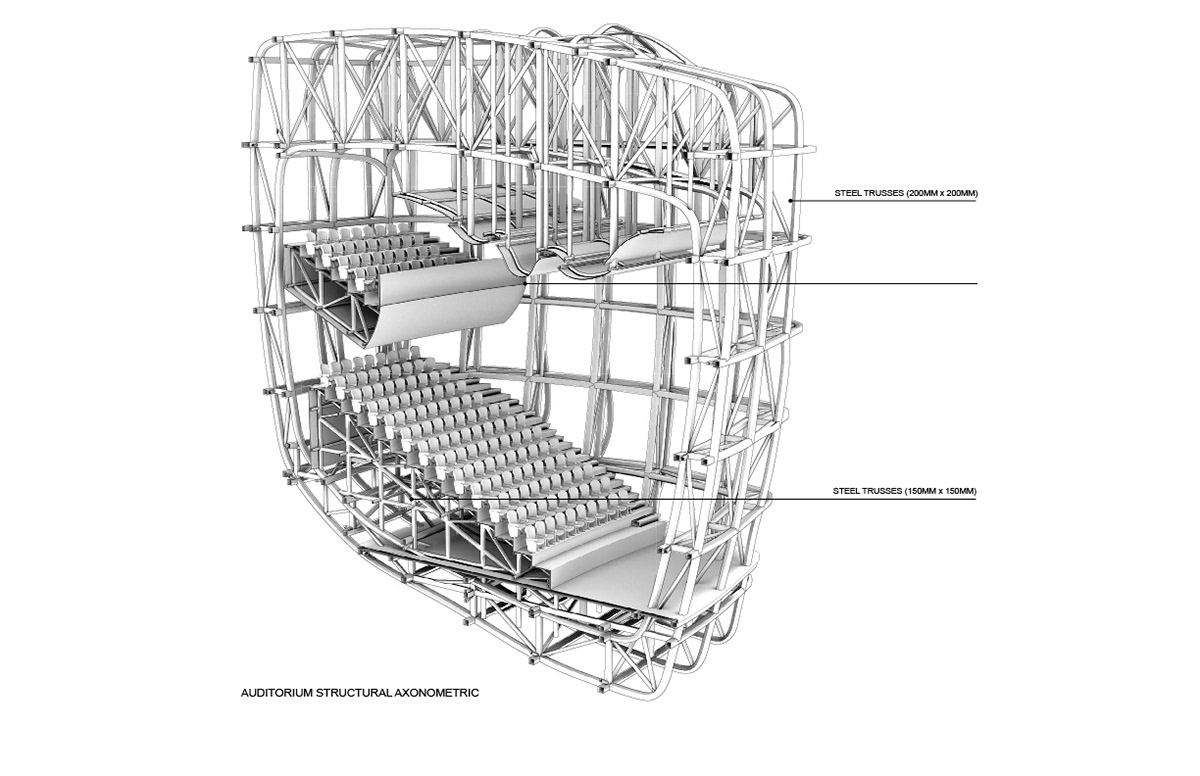 The project selected was designed in the 2GAX studio and required custom systems and materials to achieve the desired architectural effects. The main and secondary structures are proposed in structural steel framing systems with concrete cores. The facade materials vary depending on the area. The main facade is composed of cast acrylic and metal to achieve multiple layers of transparency, color- ation and difraction. Additionally, the area surrounding the auditorium consists of GFRP to produce a monolithic, cloud-like effect.
