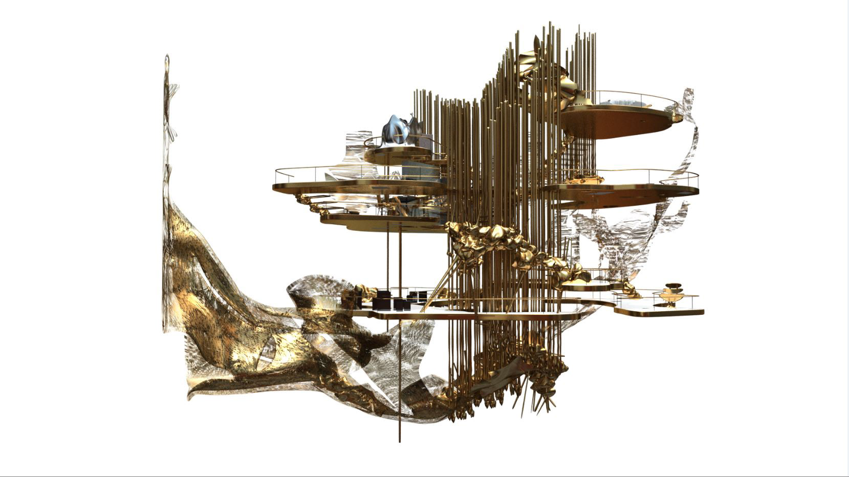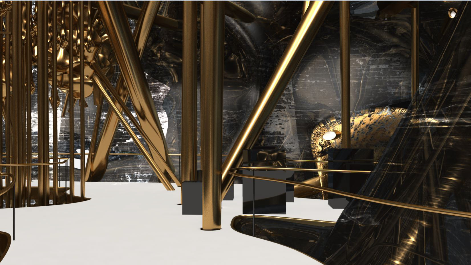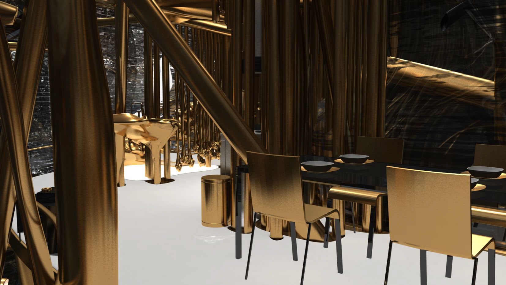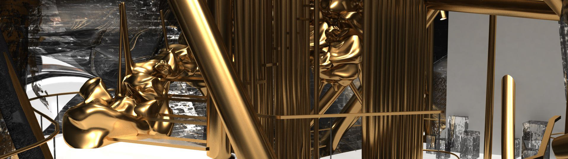 Like the piercings on the exterior shell, the house is encrusted into the Secession Building. Its primary structural elements remain untouched and intersect into the house while the roof and walls are booleaned by the new addition. There is only one entrance through a bridge connecting to a back door of the Secession, which provides direct access to the main exhibition space. The split floor slabs and multiple stairs not only provide different levels of privacy but also stimulate circulation and surprise. A mixture of highly ornamented elements and intricate textures with recognizable industrial furniture and structural components produces a new kind of coherence. The 597 piercings on the exteriors, which connect the skins, become elongated structural columns, lighting fixtures, mechanical piping and furniture in the interior.