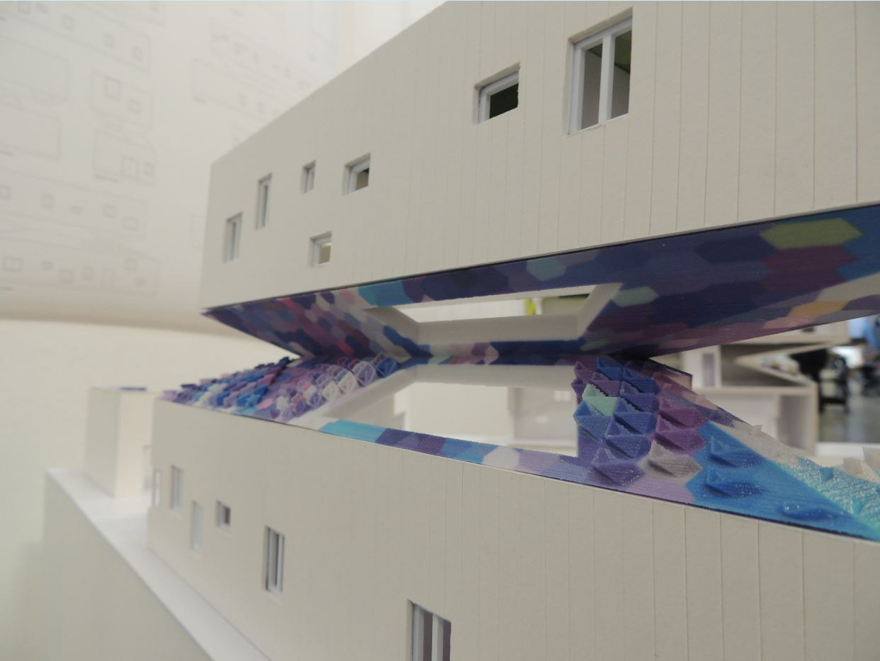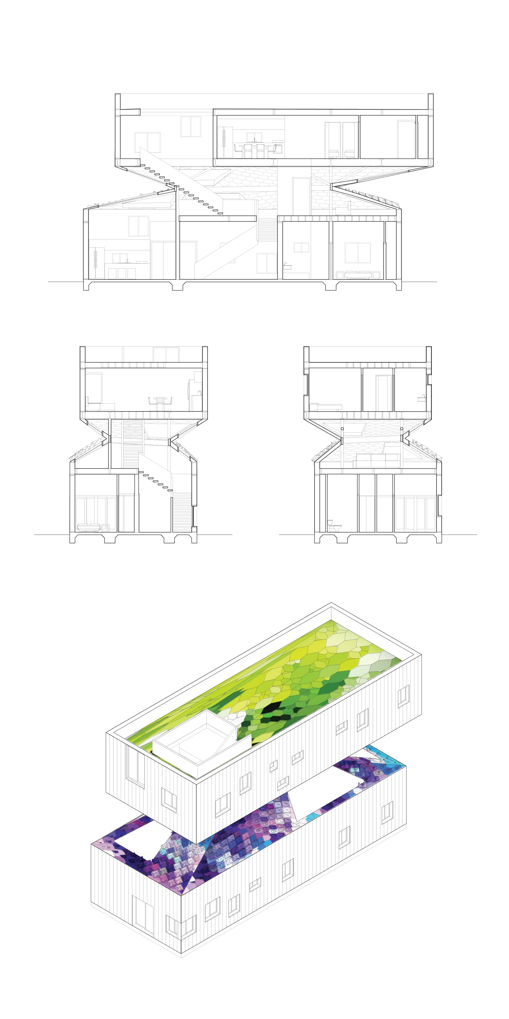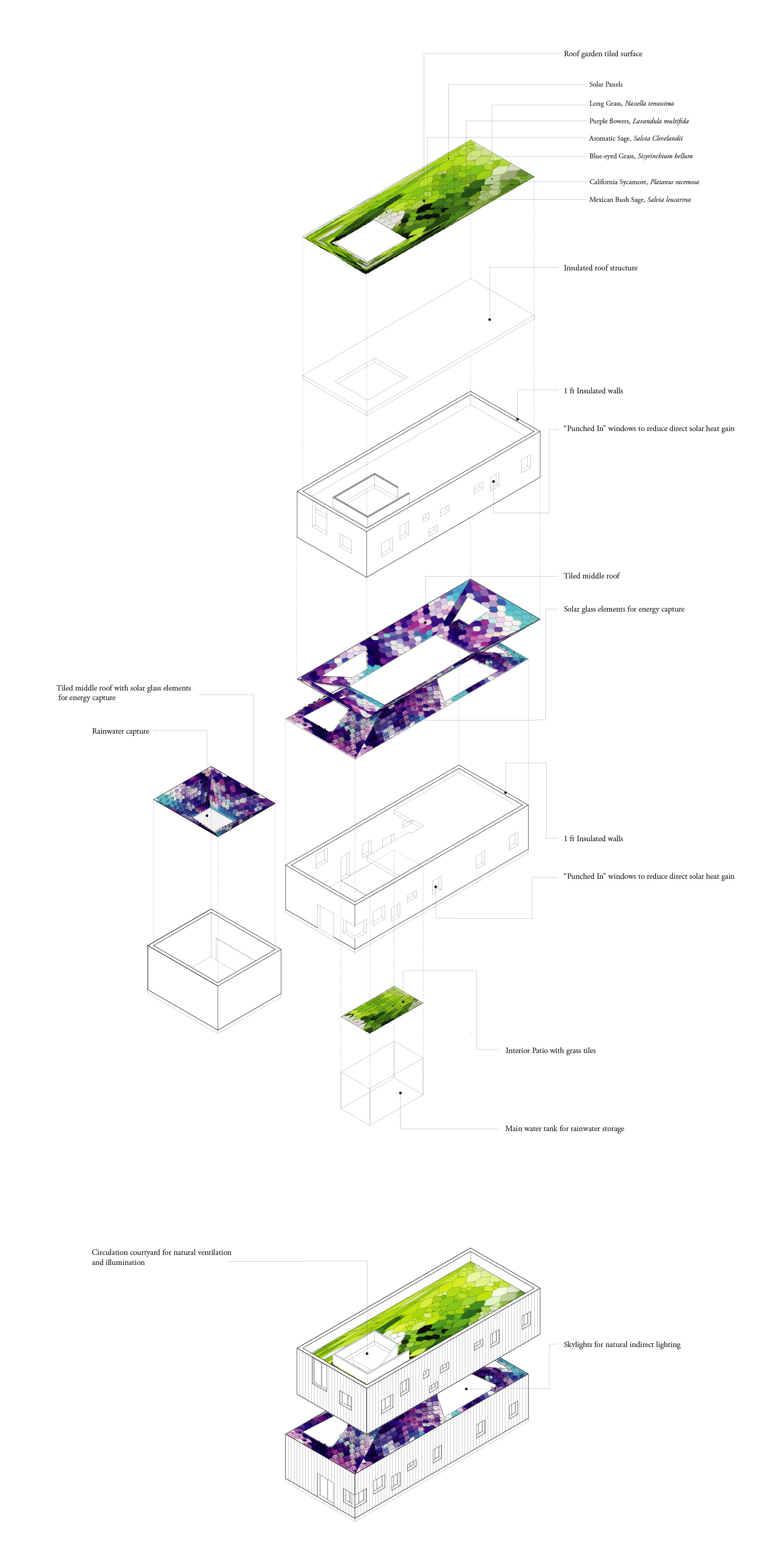 Additionally, the middle roof and the roof garden act as capture elements for solar energy and rainwater. The pattern is both visual and performative as 2D tiles transform into 3D elements to increase the active area where there is more solar exposure.