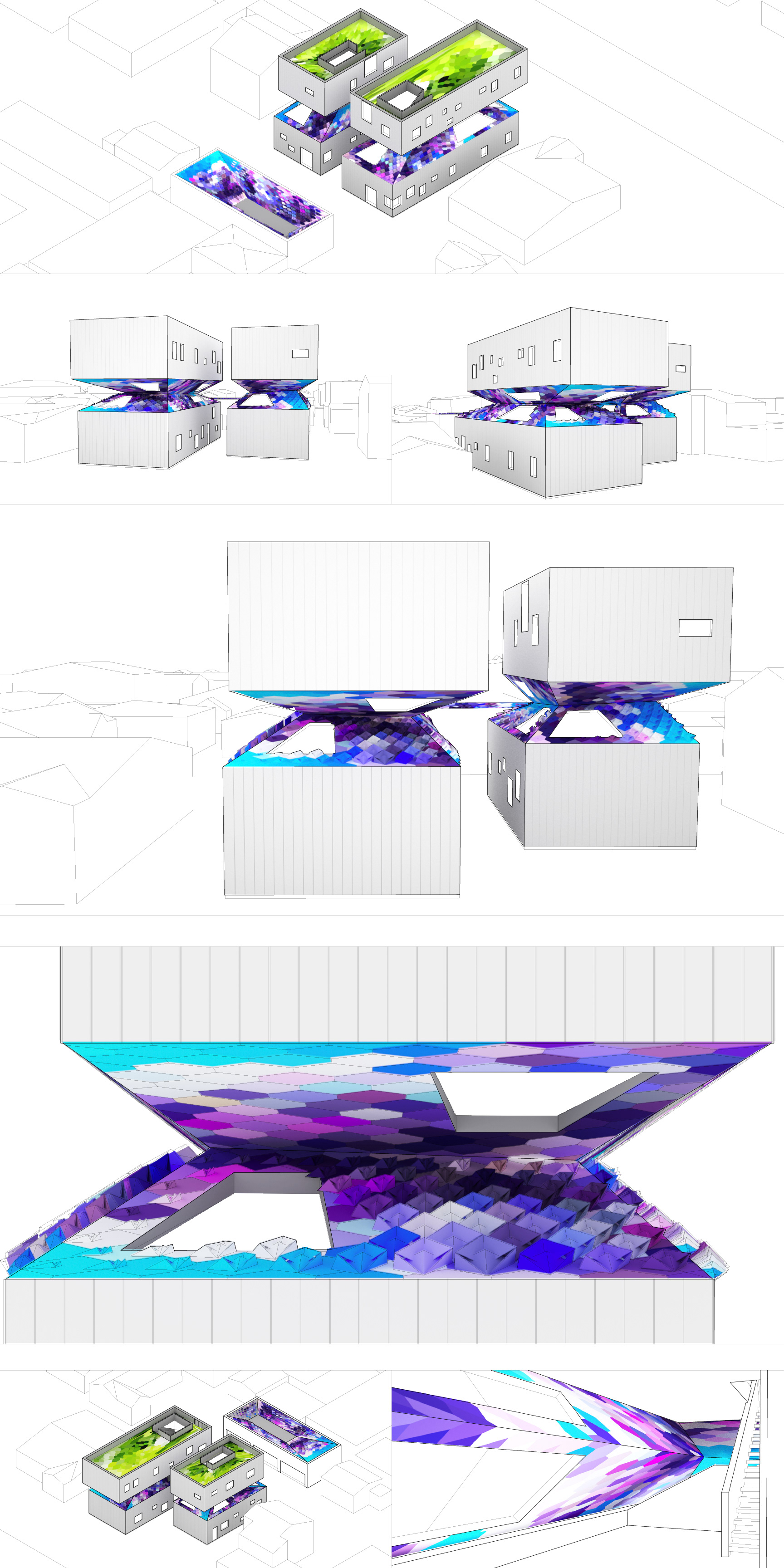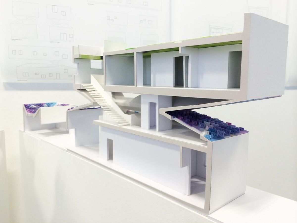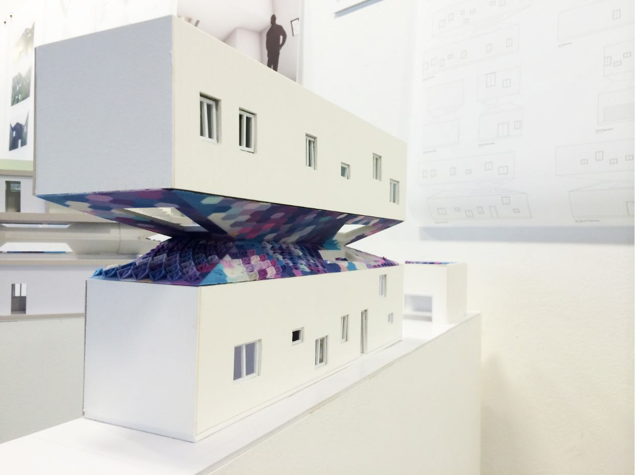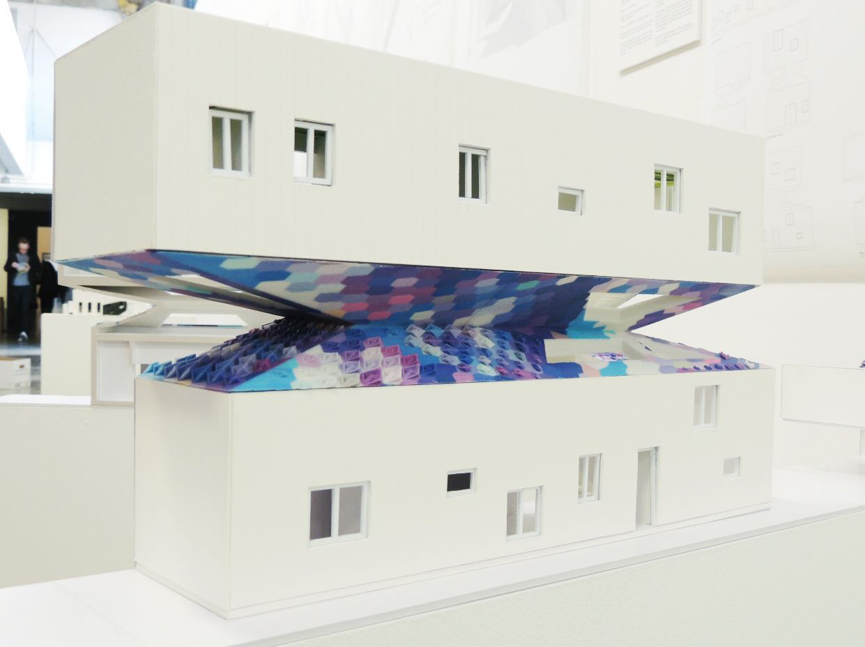 Additionally, the middle roof and the roof garden act as capture elements for solar energy and rainwater. The pattern is both visual and performative as 2D tiles transform into 3D elements to increase the active area where there is more solar exposure.