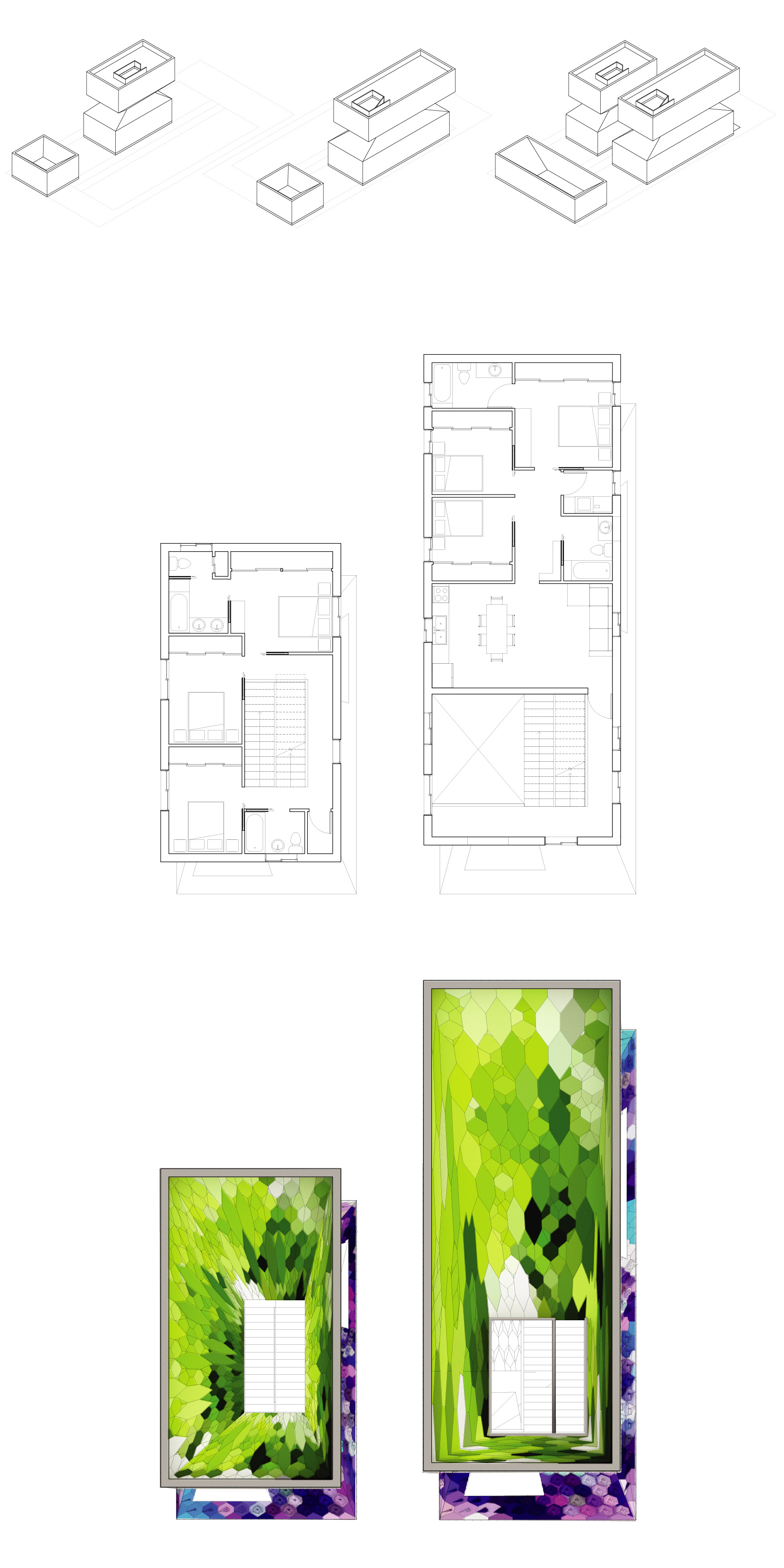 The flexibility of the scheme allows easy adjustments depending on the family needs and sizes, with models that can go from being super compact and for a single family to others that can accommodate extra rooms for extended families, or multi-family options with a duplex or even a triplex.