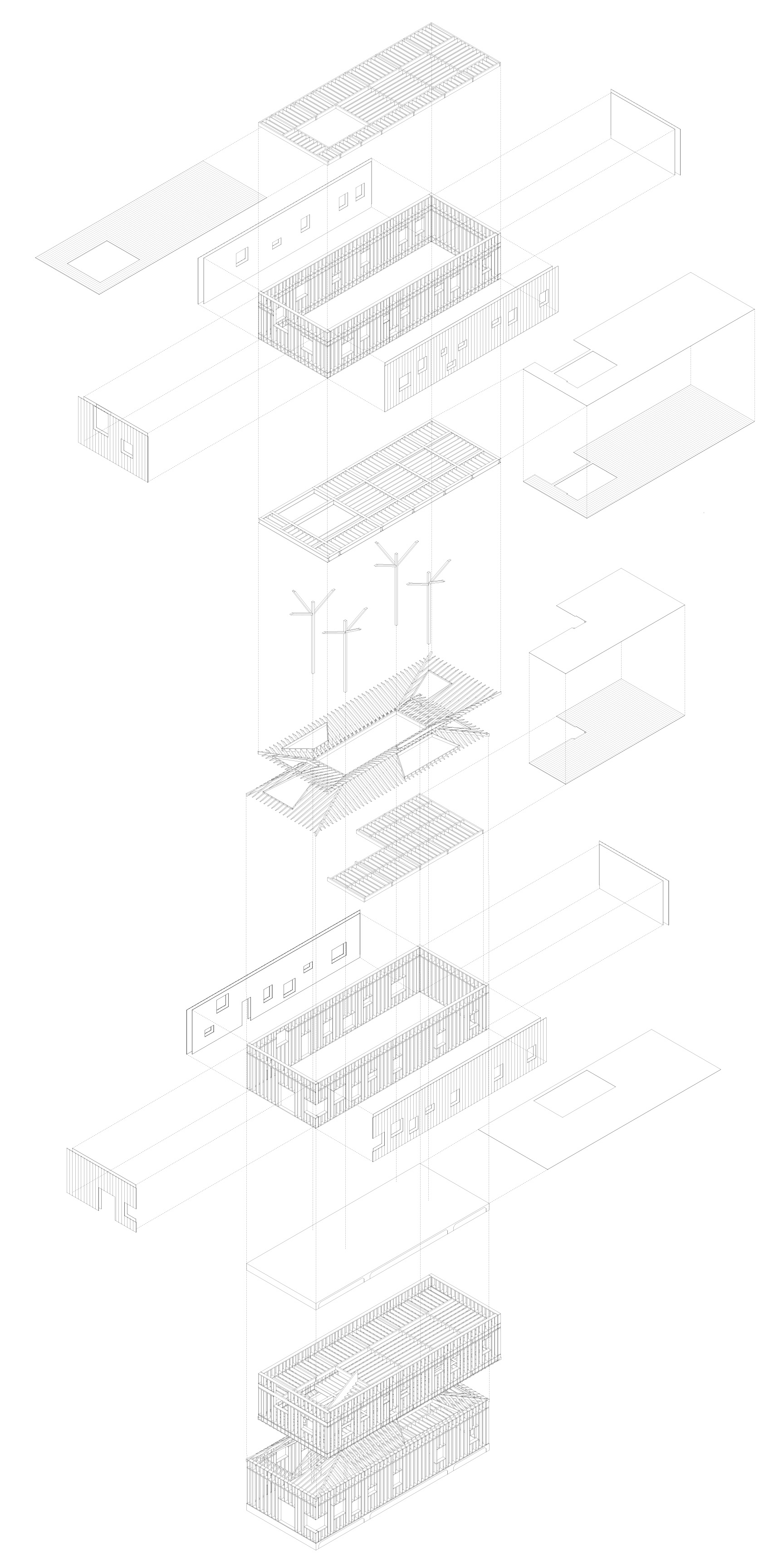 By taking two standard houses from the neighborhood, inverting one and placing it on top of the other, the idea is to give back, with a roof garden, the green area that is occupied by the footprint while, at the same time, provide a middle roof that replaces the common known attic with a more accessible and practical multiuse space.